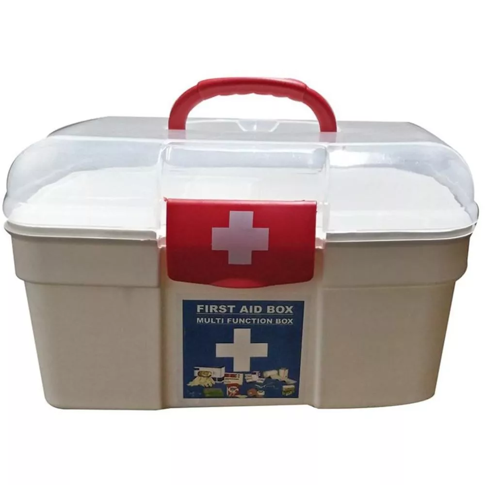 Small, empty, wall-mountable first aid box for home or office.
